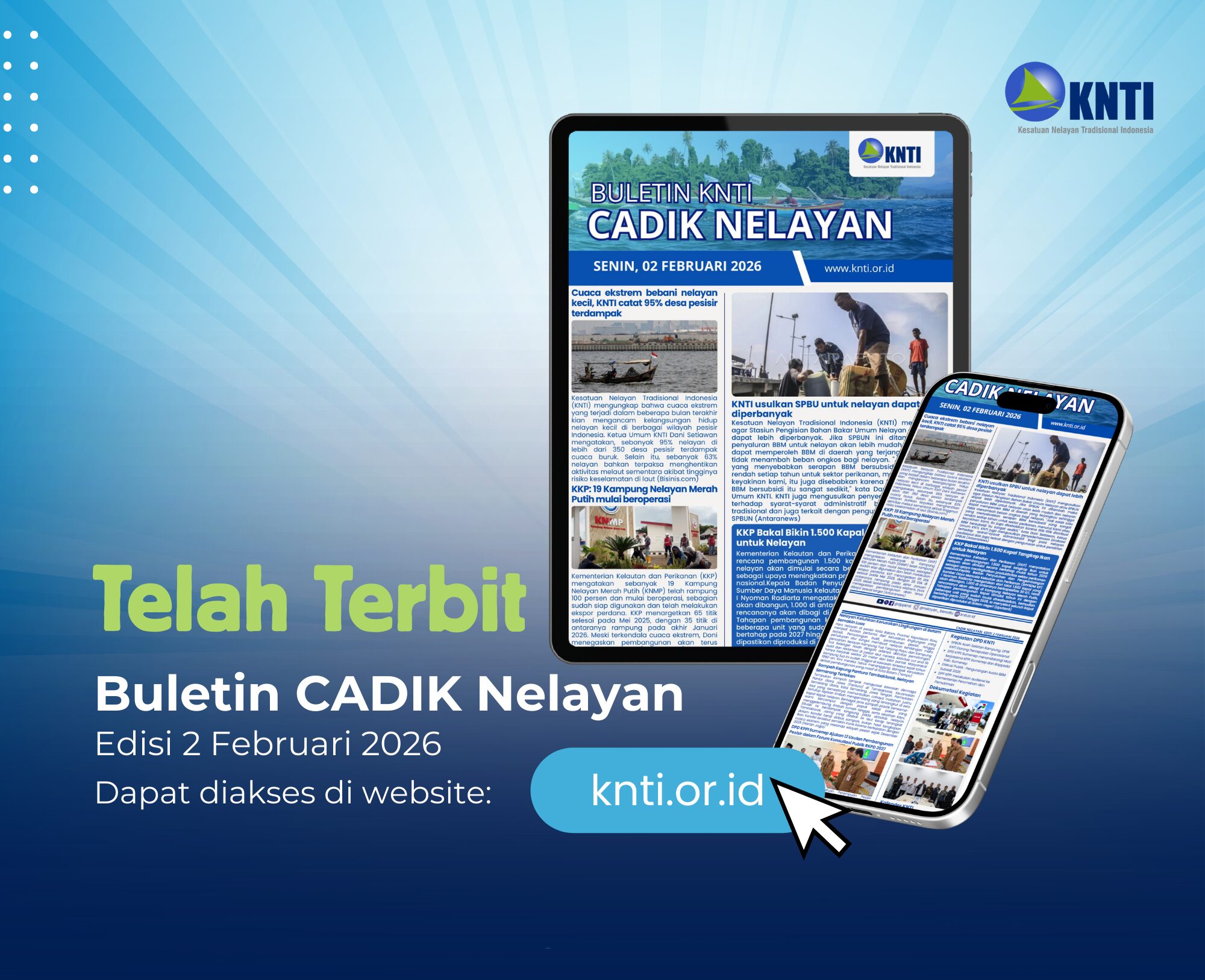 Cadik Nelayan KNTI merupakan buletin mingguan yang diterbitkan oleh DPP Kesatuan Nelayan Tradisional Indonesia (KNTI) sebagai media informasi, advokasi, serta peningkatan literasi isu kelautan dan perikanan. Edisi kali ini memuat berbagai isu penting, mulai dari kenaikan anggaran Kementerian Kelautan dan Perikanan (KKP) 2026 menjadi Rp13 triliun untuk mendukung swasembada pangan